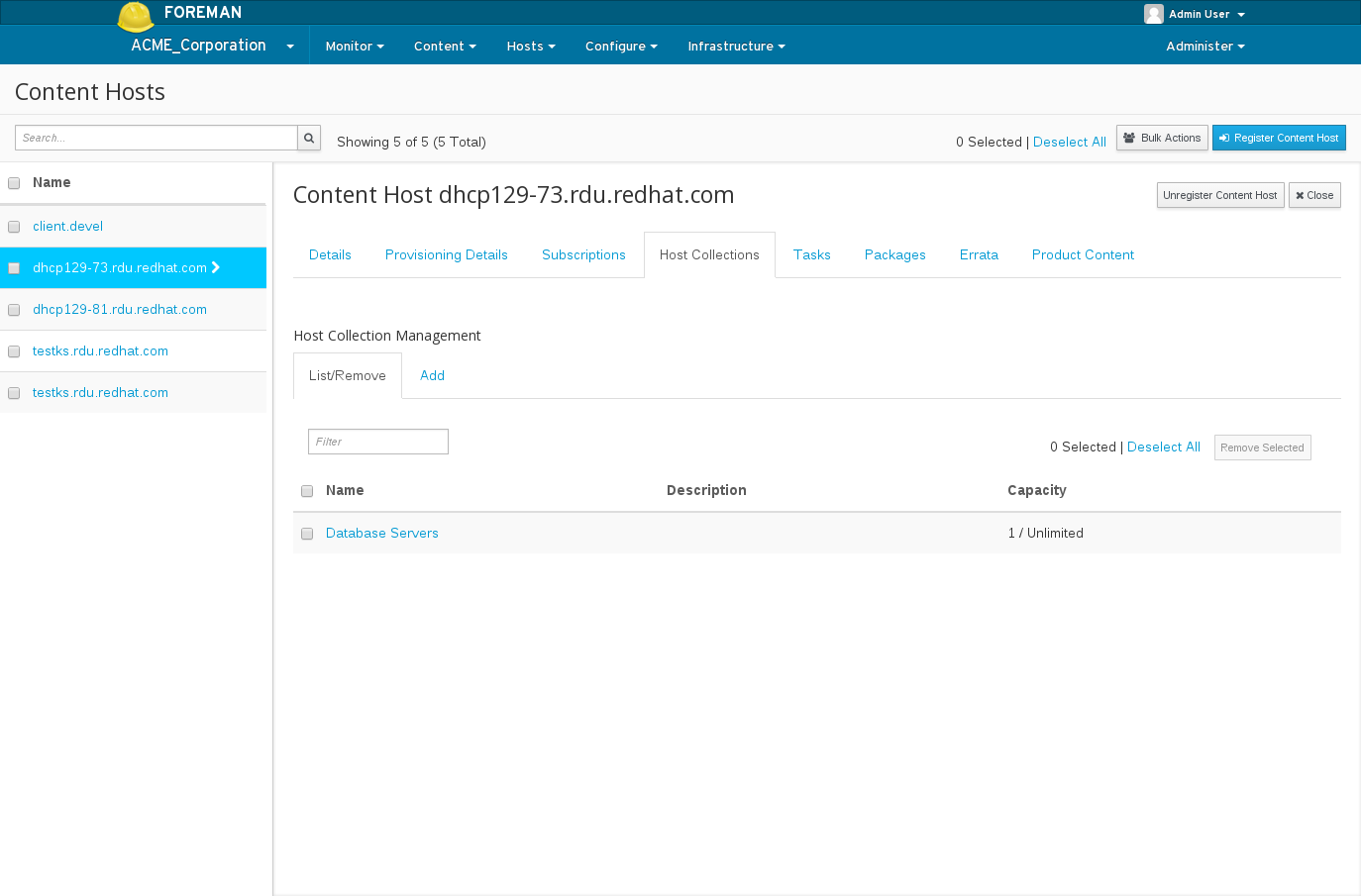To change Host Collection assignments for a Content Host, navigate to: Hosts > Content Hosts > Select Content Host > Host Collections