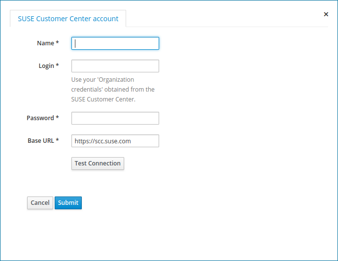 First of all, you need to add your SUSE SCC account. Use the button “Add SCC account” on the page “Content > SUSE Subscriptions” and configure your account. Verify that your account is configured correctly and the SUSE SCC portal is reachable with “Test Connection”.